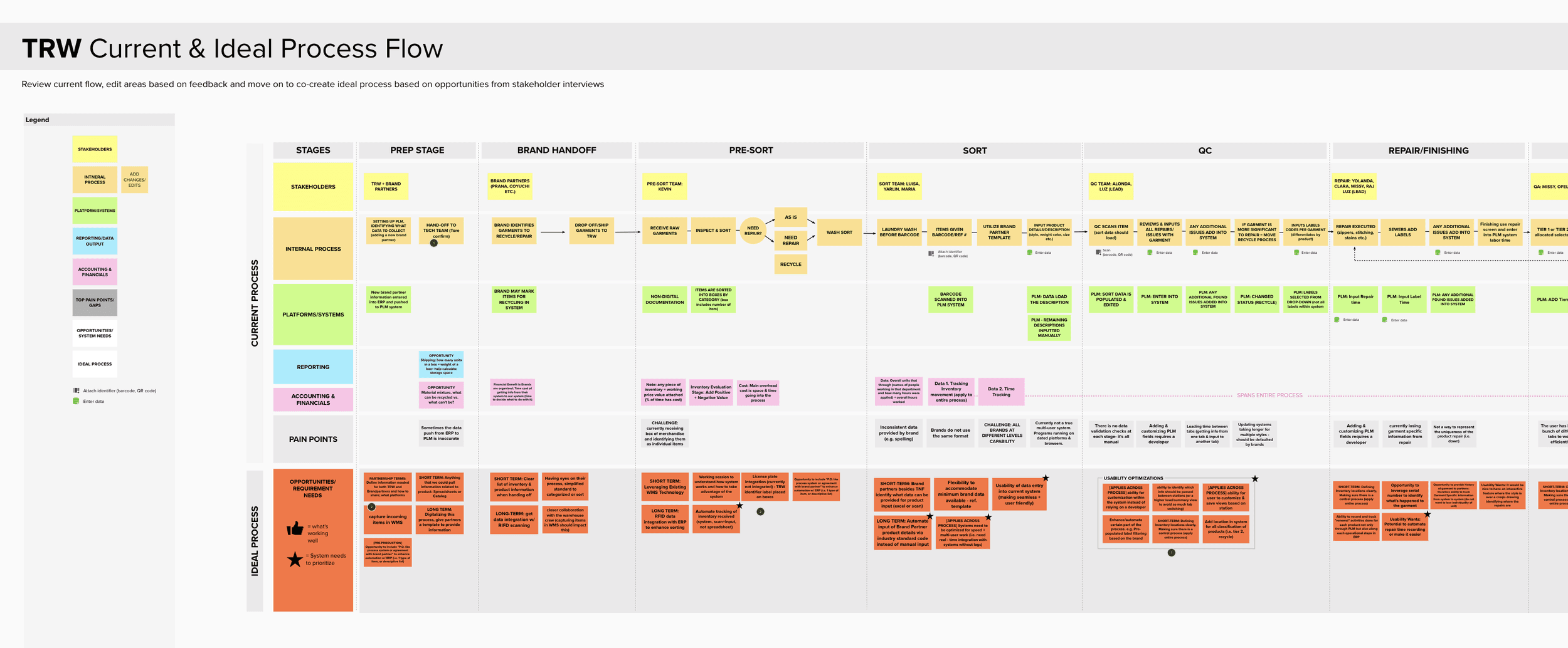 The Renewal Workshop’s mission was to provide the apparel industry with a completely circular and sustainable solution, and provide customers with a way to become zero waste consumers. As a startup, they were beginning to experience some growing pains: their existing inventory tracking system had become too cumbersome to use as their business grew, requiring manual input at many points in the process, and contained many points where errors or data loss could potentially be introduced. TRW had begun the process of designing and developing a custom inventory tracking system suited to their unique requirements, but first, they needed help documenting existing pain points and visualizing the bigger picture.